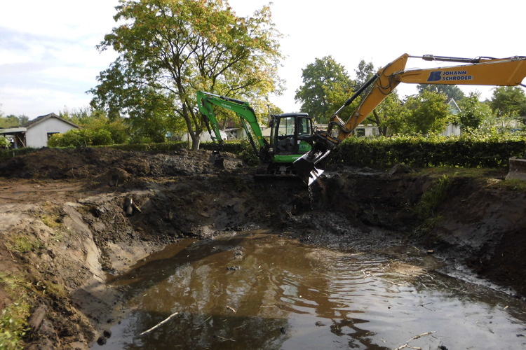 Wir suchten nach Unterstützung und fanden diese dann bei der regionalen Stiftung der Landessparkasse zu Oldenburg! Mit einer großzügigen Zuwendung der LzO-Stiftung konnten wir einen Fachbetrieb des Landschaftsbaus mit dem Teichaushub, dem Abtragen des Oberbodens, der Modellierung einer Wall Fläche und dem Planieren beauftragen. Am 9. September rollten dann die Bagger an. Doch vorab und auch nach den Modellierungsarbeiten war und ist noch viel Handarbeit zu erledigen. Armin und Rolf sind weiterhin unermüdlich dabei, die Gestaltung des Teichs und seiner Uferbereiche voranzubringen. Es ist eine Mammutaufgabe, die insbesondere die beiden da bewältigen! Ein großer Dank an die regionale Stiftung der Landessparkasse zu Oldenburg für ihre Unterstützung und ebenso an Armin und Rolf, die beide unermüdlich an der Biotopgestaltung arbeiten!